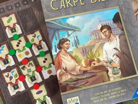 Carpe Diem board game เกมแนวต่อไทล์สร้างเมืองแบบเบาๆ สไตล์ Stefan Feld ที่ Rule Book บางเฉียบอ่านแล้วเล่นได้เลย วิธีเล่นง่ายเว่อร์ แต่ละ turn เดินไม่ซ้ายก็ขวา 1 ช่องหยิบไทล์ 1 อัน วางในกระดานเรา โดยวางต่อกันให้ได้รูปก็พอ Tile มี 12 แบบ พื้นที่ 4 แบบ เลี้ยงไก่ เลี้ยงปลา ปลูกองุ่น ปลูกชา เพื่อเอาของที่ได้ไปแลกแต้มตอนจบแต่ละรอบใหญ่...